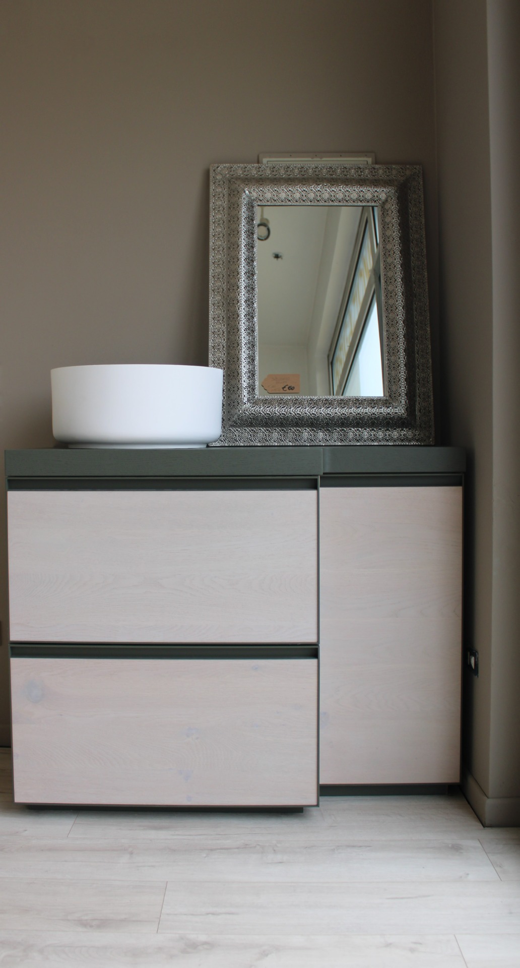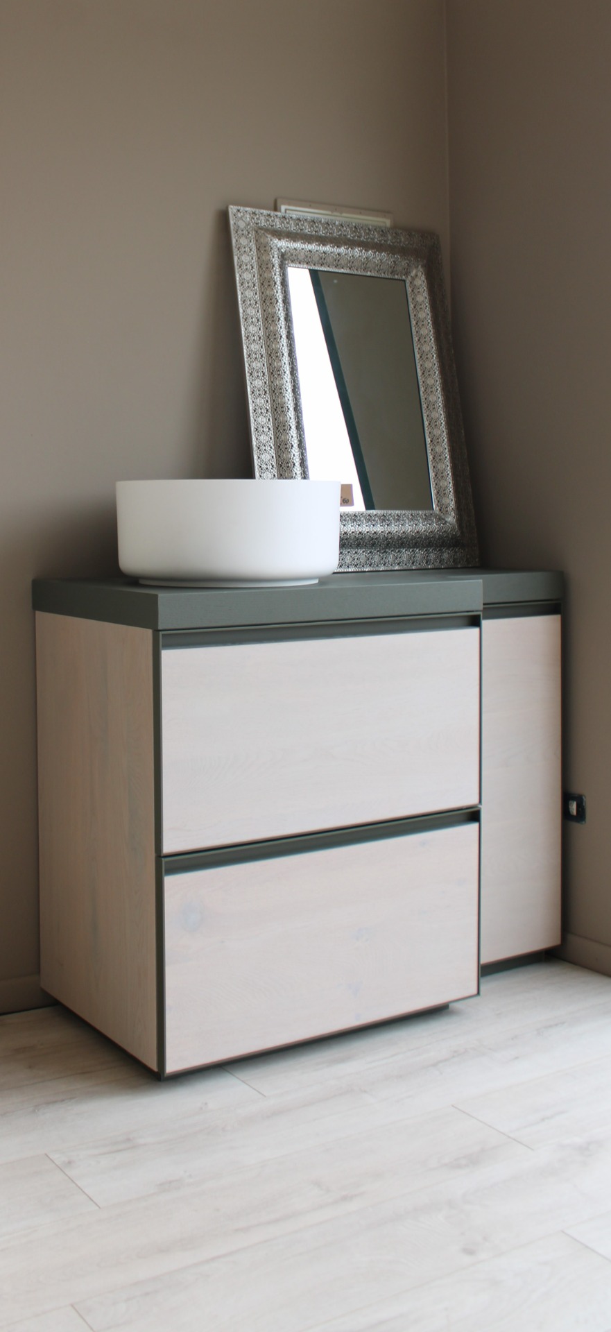 Mobile arcom collezione shape rovere, con profilo metallico in verde bosco. dimensioni : lunghezza 105, profondità da 50 a 35 cm.
